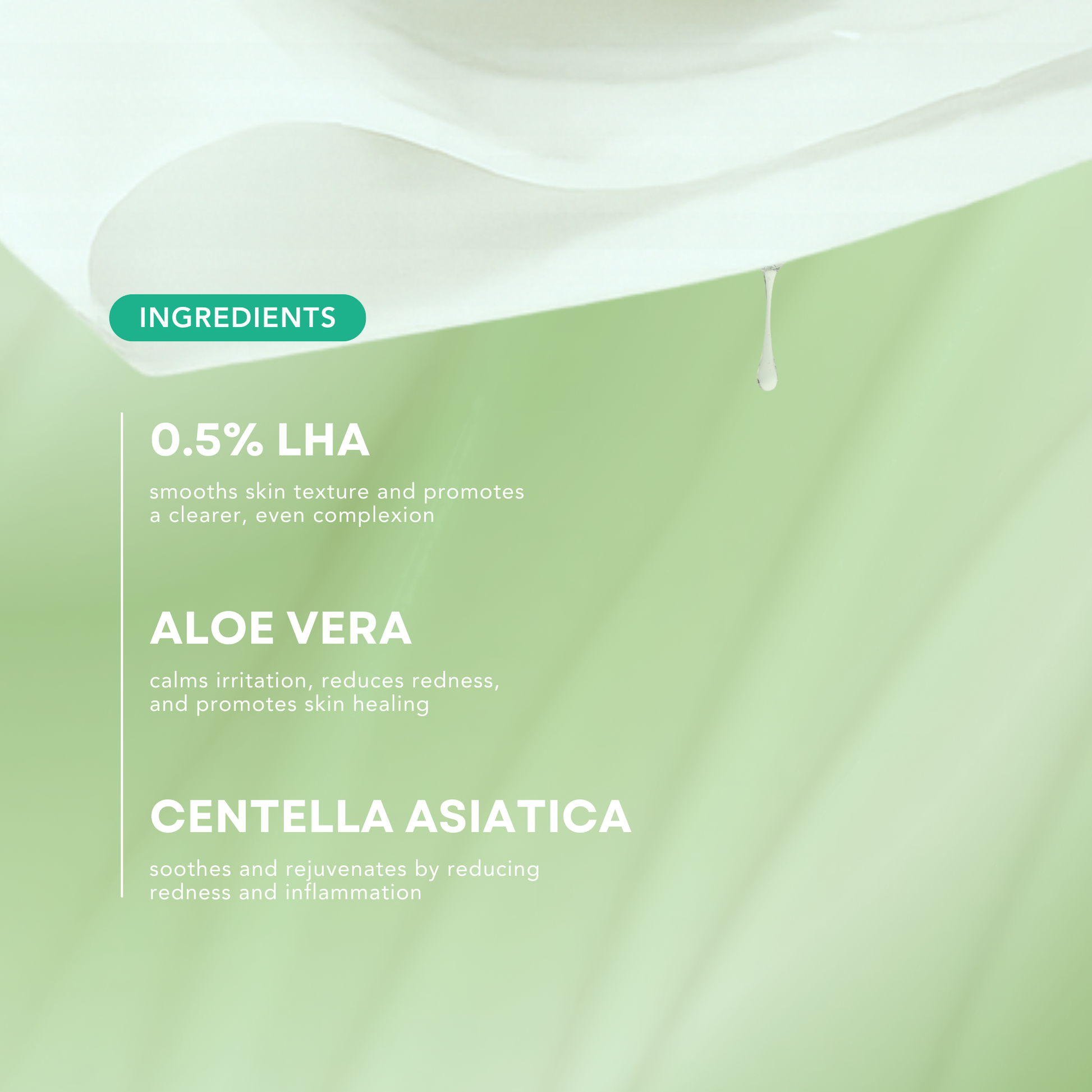 Key Ingredients: 0.5% LHA + Bisabolol, Centella Asiatica, Aloe Vera